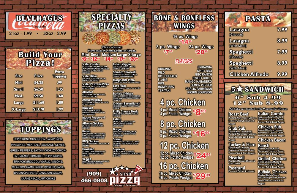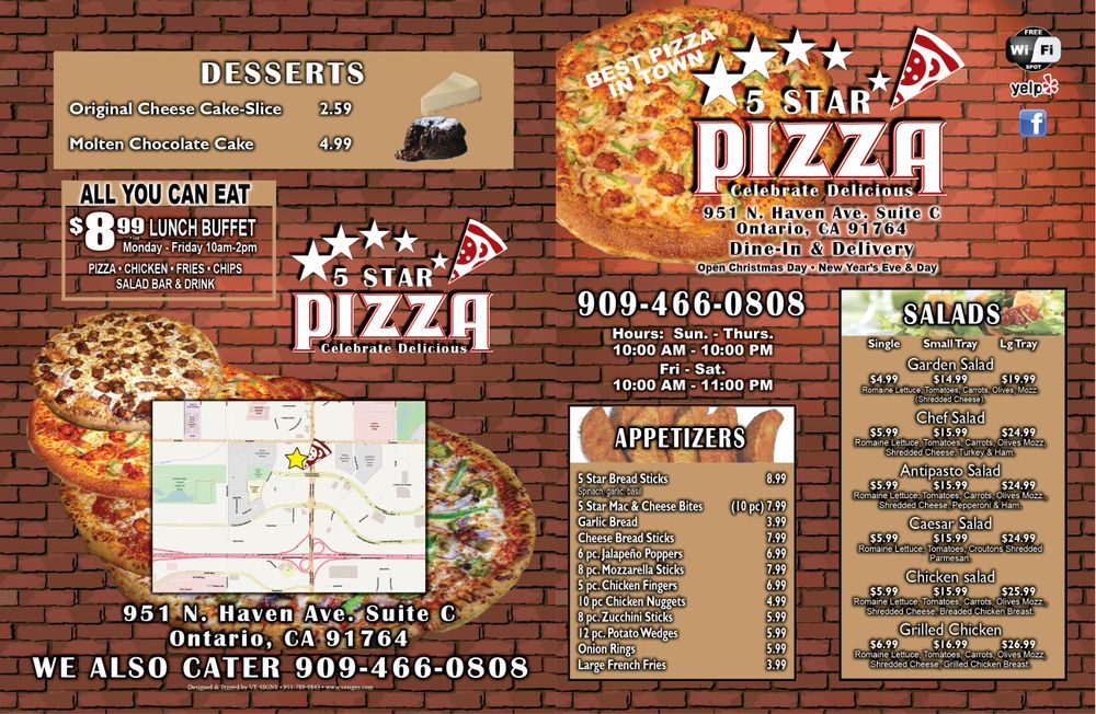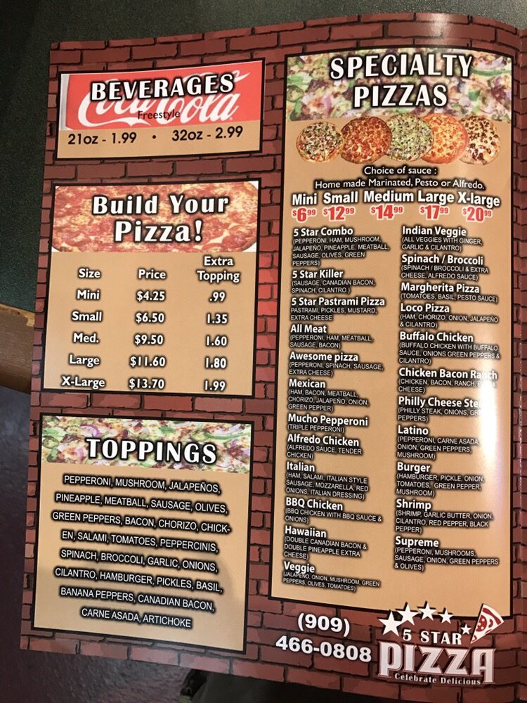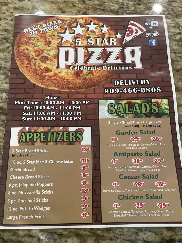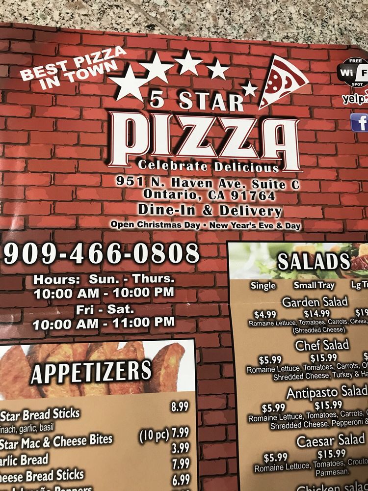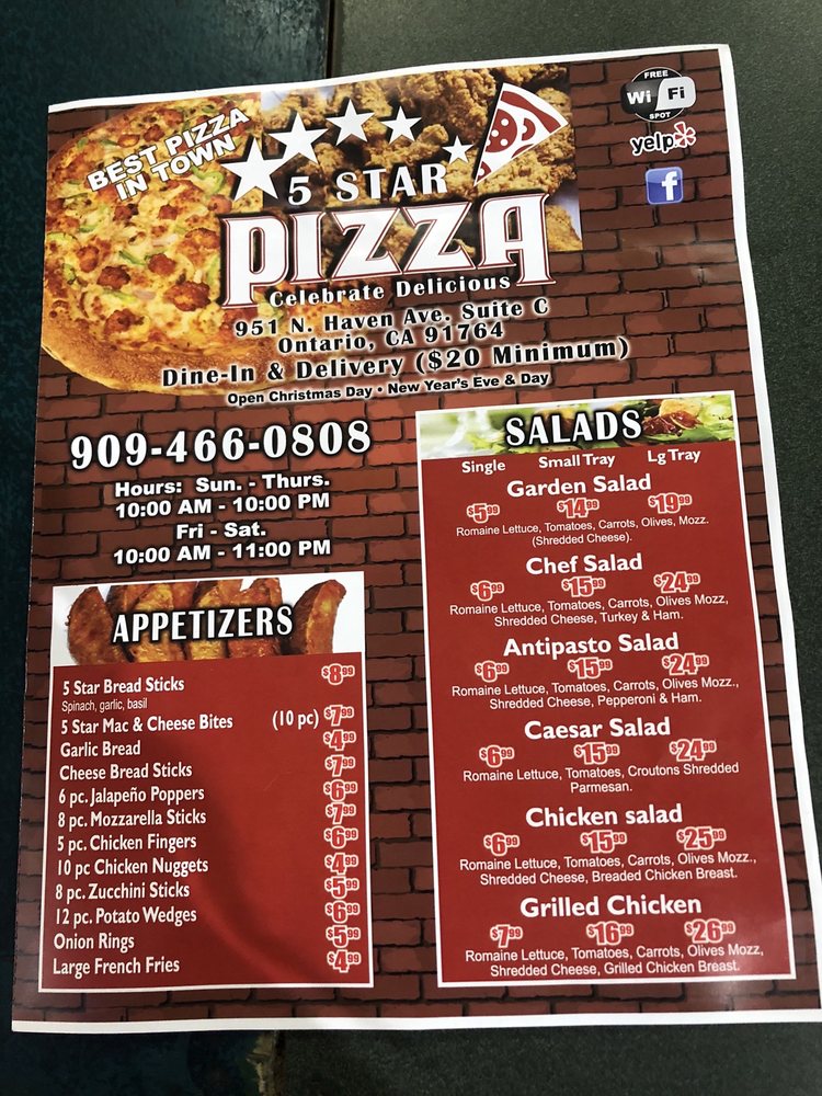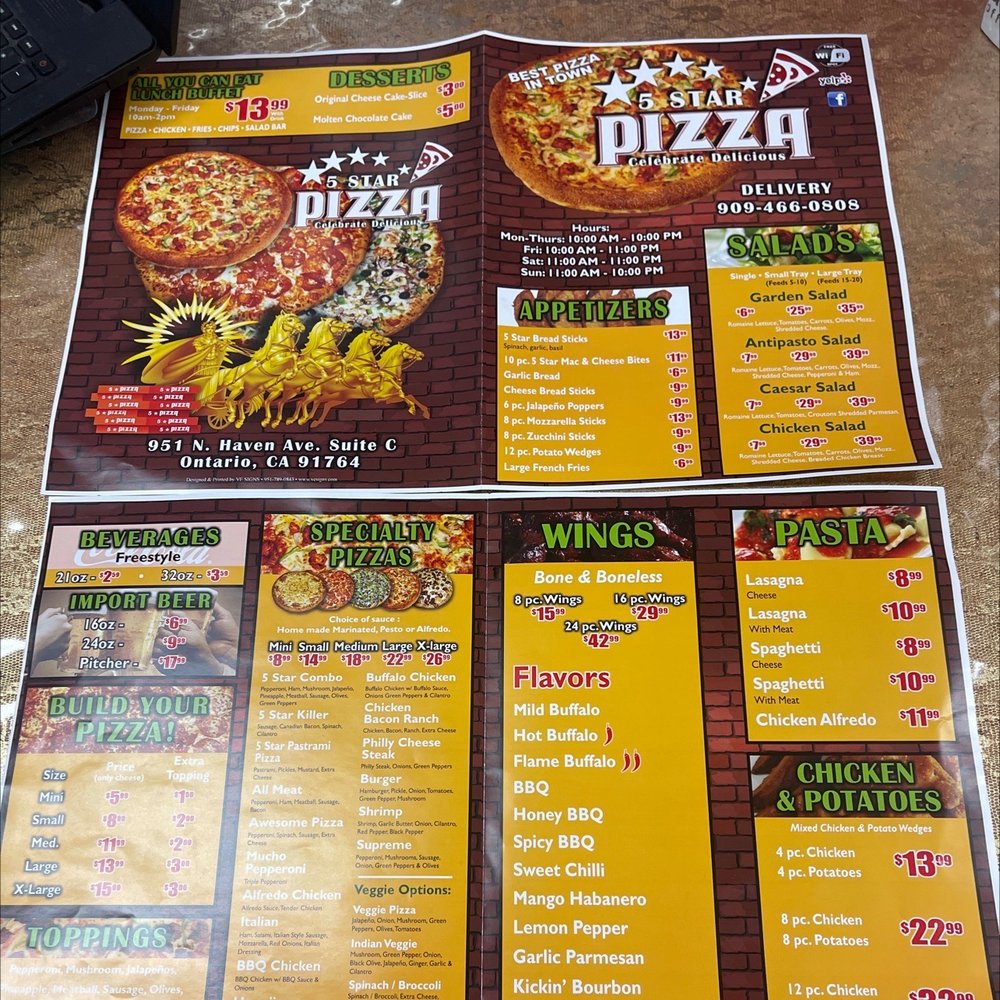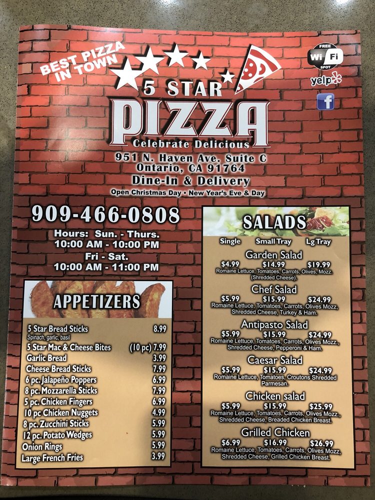 Introducing 5 Star Pizza, a gem nestled in Ontario, CA, where each dish tells a story of passion and flavor. Renowned for its crispy crust and fresh ingredients, the menu is a delightful blend of classic and innovative pizza offerings. You can savor the Hawaiian pizza, loved for its gooey cheese and warm, tropical notes, or indulge in the BBQ pizza, praised for its flavor-packed, smoky goodness.